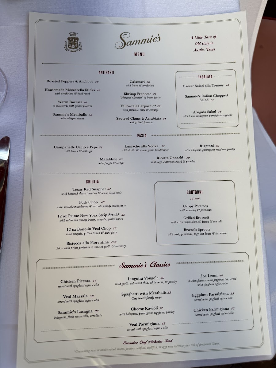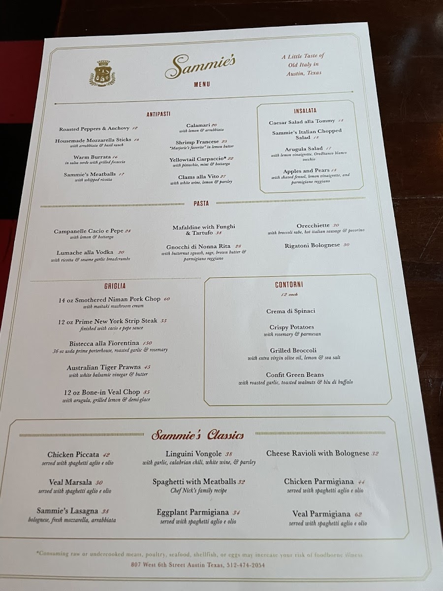 Located in the vibrant heart of downtown Austin, Sammie's offers a delightful journey through Italian cuisine. The menu features a range of enticing options, from the classic Caesar salad to hearty pasta dishes, including a highly praised gnocchi. For those seeking a rich entrée, the Bistecca Alla Fiorentina stands out at $150, highlighting the restaurant's commitment to premium ingredients. Other notable dishes include the Dry Aged New York Strip and the succulent Pork Chop, each accompanied by fresh seasonal sides.